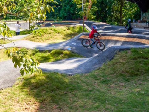 New 3m wide 150m long BMX pump track located within the woodland area. Consisting of tarmacadam surface, edged with rubber crumb and including: