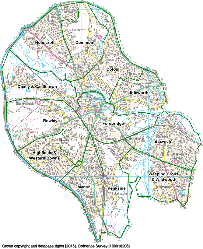 The unparished area of Stafford has 47,026 electors and for borough electoral purposes is split into 12 wards, represented by a total of 19 councillors.